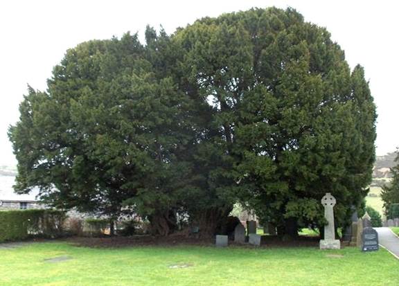 Это обычный тис в Ллангернью, Уэльс, он начал расти в бронзовом веке в Великобритании, 3000 или 4000 лет назад. Тис смог прожить так долго, за счет новых побегов. Когда основной ствол отмирал, эти побеги продолжать расти. Новые побеги питались за счет гниющего основного растения, пока не достигали почвы у основания.