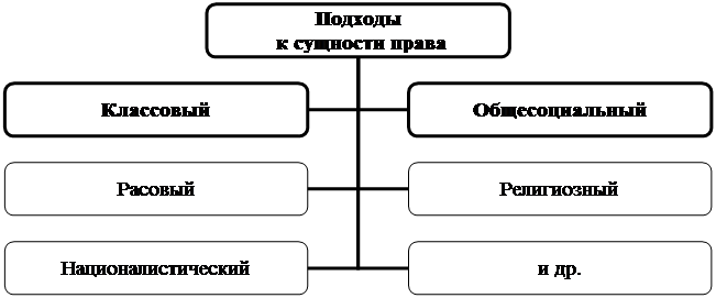 Сущность права – это его внутреннее содержание, отражающее его истинную природу и назначение в обществе, вывод о котором можно сделать, только исходя из следующих взаимосвязанных положений: А) право – это регулятор общественных отношений; Б) главное предназначение этого регулятора общественных отношений - реализация интересов. Существующие подходы к определению сущности права исходят из того, что оно, в разных случаях, призвано реализовывать интересы: всего общества, определенных классов, религиозных, этнических и иных групп (Схема 7.4).