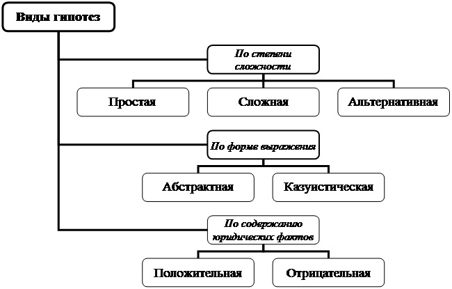 Норма права представляет собой систему, так как состоит из трех элементов: гипотезы, диспозиции, санкции. Однако, сравнивая её с системой права, систему нормы права часто называют микросистемой (что является одним из признаков нормы права). Логическое содержание нормы права соответствует связке: «если – то – иначе», в которой первый элемент – «если» (диспозиция) – содержит условие, второй – «то» (диспозиция) – содержит модель поведения, необходимую в данных условиях, а третий – «иначе» (санкция) – последствия, наступающие в результате выполнения или невыполнения требований диспозиции. Гипотеза – это элемент нормы права, содержащий информацию об условиях, при наличии которых действует данное правило поведения.