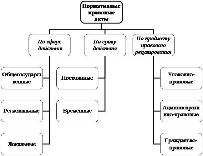 По сфере действия,по сроку действия, по предмету правового регулирования (Схема 10.4):