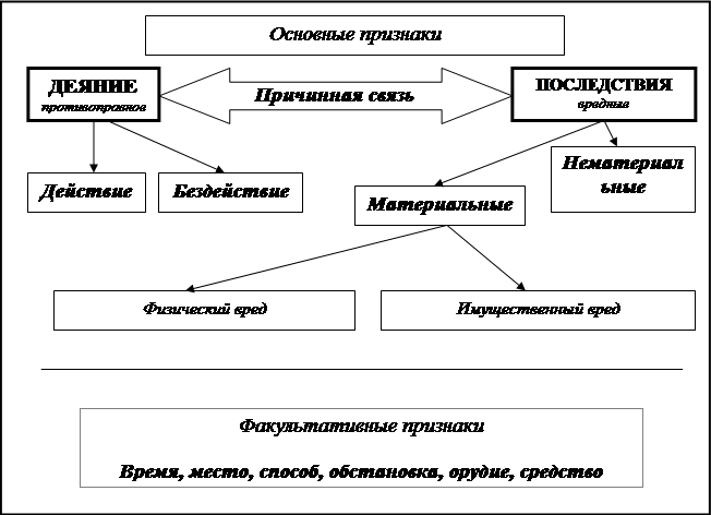 Деяние является основным признаком правонарушения. Может совершаться в форме действия или бездействия. Действие – активно поведение человека, которое может выражаться в каких-либо телодвижениях, словах. Бездействие – пассивное поведение человека, которое выражается в невыполнении им возложенной на него обязанности (обязанностей). Вредные или общественно-опасные последствия – это вред (ущерб), причиненный объекту правовой охраны в результате совершенного общественно-опасного деяния. Вредные последствия могут материальными (имущественные, физические) и нематериальными (моральные, организационные, политические и т.д.) Причинная связь – это такое отношение между деянием и последствием, при котором деяние (причина) закономерно, с внутренней необходимостью порождает, вызывает другое явление (следствие). Способ – это совокупность приемов и методов, которые были использованы при совершении правонарушения (тайный, открытый способ хищения). Средства и орудия – это материальные предметы, вещества, физические процессы, используемые в процессе совершения правонарушения для воздействия на предмет правонарушения или потерпевшего (нож, яд, электричество и т.д.). Место – определенная часть пространства, в пределах которой совершения правонарушение, которая имеет юридическое значение (например, место службы при дезертирстве). Обстановка – это условия, сопутствующие совершению правонарушения (обстановка чрезвычайного положения м т.п.). Время приобретает важное значение, если о нем есть упоминание в норме права, например, при дезертирстве.