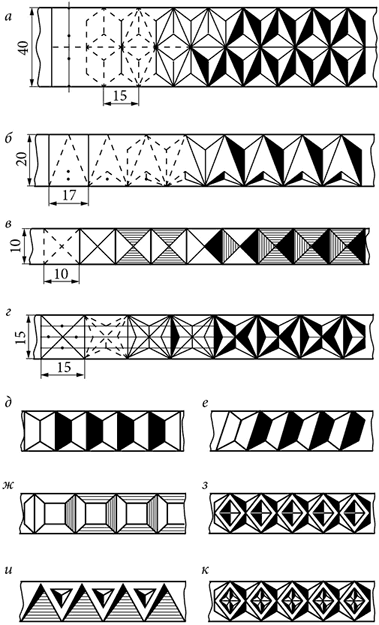 Рис. 22. Выполнение узоров в геометрической резьбе: а – узор «розетка»; б – узор «елочка»; в – узор «соты»; г – узор «звездочка»; д – узор «лесенка» прямая; е – узор «лесенка» наклонная; ж – узор «квадраты»; з – четырехранные пирамидки, вписанные в ромбы; и – треугольники, вписанные в сколыши; к – звездочки, вписанные в соты.