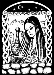 По боковым сторонам рамки несколькими параллельными линиями выжгите косички. В нижней части картины плавными округлыми линиями сделайте камни, располагая их очень близко друг к другу. Выполните тонировку в виде точек по краям каждого камня. Начните ее от краев к середине. Интенсивность тона снижайте также по направлению от периферии к центру. В верхней час ти рамки обозначьте тонкую косичку. Затем выжгите двойную дугообразную линию, начиная от левого края к правому. Под дугой создайте контур месяца. Установите ножевидный штифт, увеличьте температуру накала насадки и выжгите фон картины вокруг рамки. Штифт прикладывайте плашмя и следите за тем, чтобы фон был ровным. Чистой обувной щеткой очистите фон картины от обуглившихся кусочков древесины. Затем отшлифуйте ее стеклянной бумагой. Кисточкой нанесите несколько слоев нитролака (рис. 38).