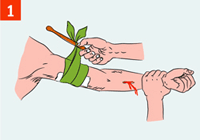 Срок нахождения жгута на конечности 1 час, по истечении которого жгут следует ослабить на 10-15 минут, предварительно зажав сосуд, и снова затянуть, но не более чем на 20-30 минут. Остановка наружного кровотечения жгутом-закруткой (более травматичный способ временной остановки кровотечения!)