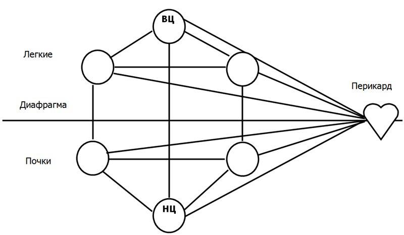 Схема отражает энергетический каркас организма в целом и, в частности, работу верхней части организма (легкие и голова) и его нижней части (мочеполовая система и брюшная полость). Посередине располагается перикард, который перераспределяет энергию между верхней и нижней частями тела. Если два центра (верхний ВЦ и нижний НЦ) уравновешены, то и кровообращение происходит гармонично – нет нагрузки на перикард.