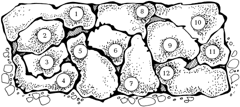 Рисунок 42. Схема «Односторонняя рабатка» № 2: 1 – космея карминно‑красная (20 шт.); 2 – львиный зев, полувысокий, лимонно‑желтый (10 шт.); 3 – петуния голубая (1 шт.); 4 – алиссум белый (10 шт.); 5 – тагетес низкий, кирпично‑красный (10 шт); 6 – львиный зев, полувысокий, абрикосовый (10 шт.); 7 – петуния белая (10 шт.); 8 – львиный зев, полувысокий, красный (15 шт.); 9 – тагетес высокий, оранжевый (10 шт.); 10 – левкои, полувысокие, бледно‑розовые (10 шт.); 11 – тагетес низкий, желтый (10 шт.); 12 – петуния фиолетовая (10 шт.)