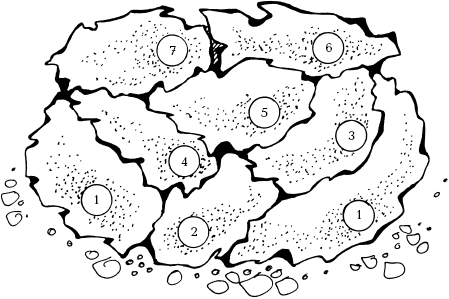 Рисунок 72. Схема «Тюльпанарий № 1»: 1 – анютины глазки; 2 – желтушник; 3 – гибрид тюльпана Фостера Pinkeen; 4 – гибрид тюльпана Кауфмана Shakespeare; 5 – тюльпан Gerbrand Kieft; 6 – тюльпан Palestrina; 7 – тюльпаны Apricot Beathy