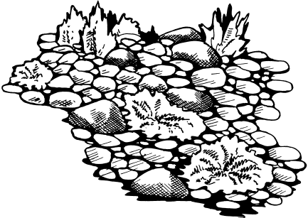 Растения в рокарии высаживают таким образом, чтобы они не закрывали камни. Примерно половину площади рокария отводят на камни и гравий, остальную оставляют для растений. Если камней используется мало, а гравия насыпано много, то такой рокарий можно назвать гравийным садом. Выбирая растения для рокария, следует отдать предпочтение тем, которые имеют оригинальную форму куста, вечнозеленые или длительное время сохраняют декоративность. Также эти растения должны быть низкими и не должны сильно разрастаться. Для рокария подходят низкорослые и стелющиеся многолетники – ландыши, подснежники, гиацинты, крокусы, колокольчики карпатские, низкорослые тюльпаны, астры альпийские, тимьян ползучий, молодило, ясколка, пушкиния, вероника ползучая и др. В рокариях хорошо смотрятся карликовые хвойные деревья и декоративные кустарники. Рядом с вышеназванными растениями можно посадить и альпийские. Важно, чтобы они были совместимы и хорошо росли рядом друг с другом. Также необходимо учитывать, что альпийские растения, произрастающие в каменистой местности, привыкли к другим климатическим и почвенным условиям, нежели в Средней полосе России. В связи с этим, альпийские растения выращивают в специальных условиях на подготовленной почве. Специализированные фирмы предлагают в настоящее время большое количество различных растений для рокариев. Для начала будет достаточно 8 – 10 видов. Там же дают рекомендации по уходу за этими растениями. Постепенно можно дополнить рокарий и другими видами растений. Для создания каменистой среды используют различные камни: песчаник, гранит, известняк, порфит, ракушечник. Эффектно смотрятся камни одной породы с грубыми обломками и средними и мелкими камнями. Перед созданием рокария необходимо составить его план и общий вид (рис. 79). Затем с помощью веревки ограничить участок для будущего рокария. Его нужно сделать немного больше истинных границ рокария. Работу лучше проводить в то время, когда земля сухая. Из земли сначала удаляют сорняки. Если их много, то можно воспользоваться гербицидами. Со всей площади рокария удаляют слой толщиной 30 см, затем создают дренаж. Его не нужно делать только в том случае, если рокарий располагается на склоне и там легкая, не глинистая почва. Во всех других случаях дренаж необходим.