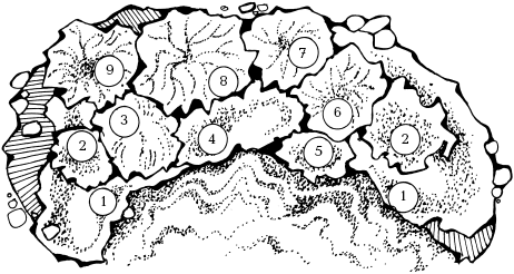 Рисунок 98. Схема «Прибрежная композиция»: 1 – бруннера крупнолистная; 2 – дерен отпрысковый; 3 – ива пурпурная; 4 – бересклет крылатый; 5 – дерен белый; 6 – бузина черная; 7 – клен красный; 8 – ирга гладкая; 9 – калина обыкновенная