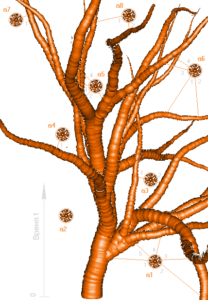 Рис.2 Время в мире розы. Эфирный план является совокупностью сечений каждой из ветвей, он представляет собой каркас, на котором держатся сечения. Эфирный план существует отдельно для каждой их ветвей, он простирается от начала дерева вперед, через настоящее, в будущее, до первой развилки. В начале дерева он был один, поскольку существовала только одна ветвь. Астральный план представляет собой все сечения всех ветвей, включая развилки в будущем. Он проецируется во множество параллельных эфирных планов, которые свои для каждого отдельного мира. Астральный план - это чертеж растущего дерева, в который постоянно вносятся изменения. Ментальный план в модели не присутствует непосредственно, он является описанием процесса или программой роста дерева. Эта программа реализуется сразу во всех возможных вариантах, образуя посредством астрального плана множество эфирных планов. Дерево миров растет в пространстве, мерность которого соответствует мерности астрального плана, но это пространство не является астральным планом, оно представляет собой Хаос. В Хаосе присутствуют отдельные островки, напоминающие сечения дерева, у которых есть и свой физический план, вышедший из общей программы ментального роста дерева (точнее, присутствующий в ней не запланировано или в результате ошибки программы или программиста). Эти острова среди Хаоса создают в основном Маги, когда решаются испробовать себя в искусстве творения миров, хотя часть островов образовалась просто в результате естественной кристаллизации Хаоса (см. рис.1, остров a2). Закон на этих островах весьма своеобразный - это либо закон создателя острова, либо случайный закон, в случае самостоятельного образования острова. Острова являются набором из нескольких сечений, которые чередуются по ходу времени. Это связано с тем, что создать полноценно растущую ветвь вне ментальной программы роста дерева достаточно сложно, она получается нежизнеспособной. Рассмотрим остров a4 (см. рис.1), он был когда-то создан в одном из параллельных миров и тропинка туда, обозначенная цифрой 1, лежит лишь в какой-то одной точке развития конкретного варианта физического плана. Но на астральном плане пройти туда очень легко, поскольку там не существует времени как такового. Другой вид острова, например, а3, образуется, когда Маг и его двойник в параллельном мире действуют совместно. Существует особая техника переговоров со своим отражением в параллельном мире для осуществления каких-то совместных действий. Нечто подобное острову а3 образуется, когда двойник или другой человек, просто заходит на созданный остров с физического или астрального плана. Если вход произведен с плана физического, то есть хороший шанс там и остаться, поскольку через мгновение обратная дорога будет пролегать уже через прошлое, т.к. дерево непрерывно растет. Дерево окружает Хаос, и это вовсе не отсутствие всего, скорее наоборот. Среди пустоты, это пространство прорезают бесчисленные дороги, протоптанные когда-то или образовавшиеся самостоятельно, и служащие для переходов между отдельными точками нашего дерева и точками других деревьев (других вселенных). Примерная структура вырезки в виде куба из пространства Хаоса, содержащей перекресток, приведена на рисунке 3. Отличие реальности от рисунка состоит в отсутствии симметрии, если к
