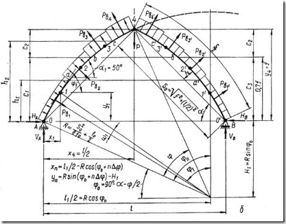 Снеговую нагрузку р определяют по нормам нагрузок и воздействий, условно равномерно распределенную по длине пролета покрытия. При расчете сегментных арок при f/l≥1/8 нужно учитывать также распределение снеговой нагрузки по треугольным эпюрам при значении коэффициента перехода в ключе 0, близ опор – от 1.6 до 2.2 с одной стороны и от 0.8 до 1.1 – с другой. Стрельчатые арки при определении снеговых нагрузок могут условно считаться треугольными. Ветровую нагрузку q определяют по нормам нагрузок и воздействий с учетом шага арок и считают приложенной нормально к поверхности покрытия. При этом для упрощения расчета криволинейные эпюры этой нагрузки можно заменять прямолинейными нормальными к хордам полуарок. При стрельчатых арках они условно могут считаться треугольными, и нагрузка распределится нормально к хордам полуарок. Сосредоточенные, временные нагрузки Р включают в себя массу подвесного оборудования и временных нагрузок на нем. Геометрический расчет арки заключается в определении всех размеров, углов и их тригонометрических функций полуарки, необходимых для дальнейших расчетов. Исходными данными при этом являются пролет l, высота f, а в стрельчатых арках также радиус полуарки r или ее высота f. По этим данным в треугольных арках определяют длину S/2 и угол наклона полуарки α. В сегментных арках определяют радиус