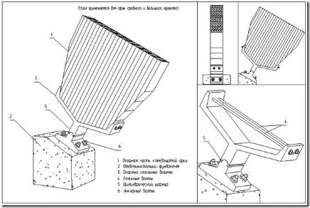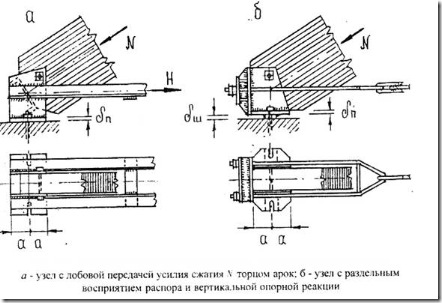 Рисунок 10 – Опорный узел Узлы сегментных и стрельчатых арок, в которых действуют изгибающие моменты разного знака и незначительные поперечные силы, центрируются по осям полуарок, а опорный лист башмака перпендикулярен им. Узлы треугольных арок, в которых действуют в основном положительные моменты и значительные поперечные силы, центрируются по расчетным осям, расположенным с эксцентриситетом относительно осей полуарок, а опорный башмак перпендикулярен равнодействующей вертикальной и горизонтальной опорных реакций.