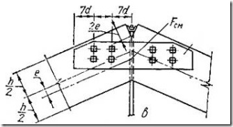 Рисунок 14 – Опорный узел с деревянной затяжкой Опорный лист в арках с затяжками располагается горизонтально, поэтому арки ставятся на горизонтальную поверхность опор, на которые не действует распор. Вертикальные фасонки могут опираться на опорный лист или опорный лист может размещаться между фасонками. При опирании на бетон опорный лист удлиняют за пределы фасонок для крепления анкеров, а при опирании на деревянную стойку фасонки опирают ниже опорного листа для крепления их к стойке болтами. Между фасонками располагается упорная диафрагма. Наклон диафрагмы и центрирование узла производятся по тем же соображениям, что и в узлах арок без затяжек. Металлическую затяжку приваривают к фасонкам, деревянную распологают между фасонками и крепят к ним болтами. Расчет опорного узла предполагает: 1) расчет диафрагмы на изгиб как балки заделанной в фасонках, на давление лобового упора δg. При этом изгибающий момент при ширине 1 см равен