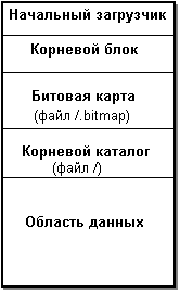 Администратор файловой системы ОС QNX позволяет стандартным образом организовать хранение и доступ к данным файловых подсистем (томов). С точки зрения логической файловой системы, хранение файлов в QNX подобно тому, какое обеспечивает ОС Unix: общее дерево каталогов с возможностью монтирования новых томов как ветвей этого общего дерева. Обеспечиваются также "жесткие" и "мягкие" связи. На физическом уровне диск QNX структурирован так, как показано на рисунке 10.3.