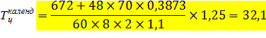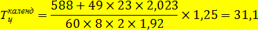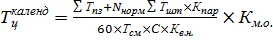 где Тцкаленд– длительность производственного цикла партии деталей, кал.дн (без учета выходных и праздничных дней); n – нормативный размер партии; ∑Тшт - суммарная норма штучного времени по всем операциям изготовления данной детали; ∑Тпз – суммарная норма подготовительно-заключительного времени по всем операциям изготовления данной детали; Кпар – коэффициент параллельности; Кпар = Тцсмеш/ Тцпосл; 60 – коэффициент перевода в часы; Тсм – нормальная продолжительность смены, час; С- количество рабочих смен в сутки; Кв.н. – плановый коэффициент выполнения нормы (для упрощения расчетов Кв.н. в курсовом проекте принимается лишь по станочным работам); Км.о. – средний коэффициент межоперационного времени, который равен 1,25-2,0; этот коэффициент показывает время междусменного и внутрисменного пролеживания, а также время технического контроля и время транспортировки деталей внутри цеха. Для проверки возможности выполнения всей программы по запуску деталей в течение месяца исходят из определившейся длительности производственного цикла обработки партии деталей и производят дополнительный расчет по следующей формуле: