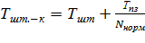 При проектировании участка необходимо иметь данные о трудоемкости изделия. Трудоемкостью изделия называют время, затраченное на его изготовление и выраженное в человеко-часах (Тчел.ч.). Трудоемкость изделия определяется по нормативам, отражающим применение в производстве современных методов и средств. Расчетная трудоемкость включает в себя все нормируемое по технологическому процессу время обработки на станках. Составными частями нормы времени на операцию являются: основное (технологическое) время, вспомогательное время, время обслуживания рабочего места, время перерывов на отдых и естественные надобности и подготовительно-заключительное время, приходящееся на единицу продукции по операции. Сумма указанных времен в расчете на одну единицу продукции по операции называется штучно-калькуляционным временем. Применительно к машиностроению и серийному производству штучно-калькуляционное время (Тшт.-к) выражается формулой: