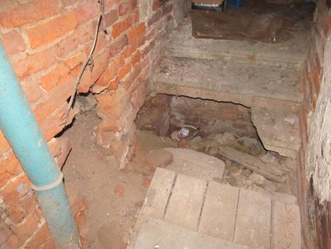 Разрушение кирпичной кладки и ступеней входа в подвал.