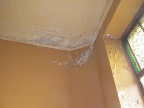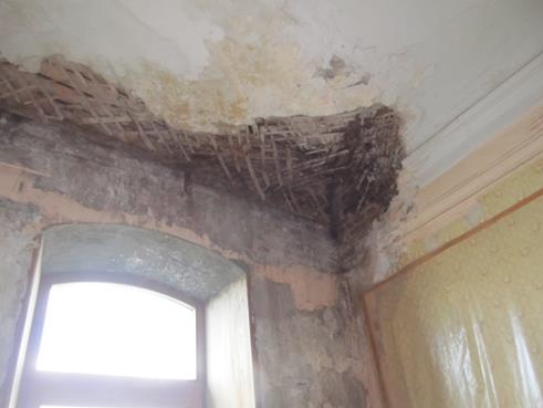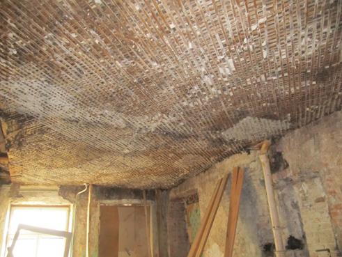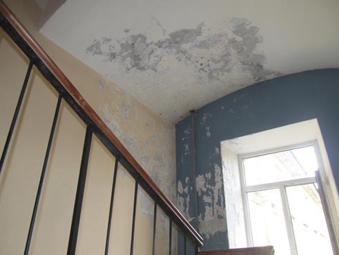 Следы замачивания, гниение балок и деревянного заполнения перекрытия, обрушение штукатурного слоя