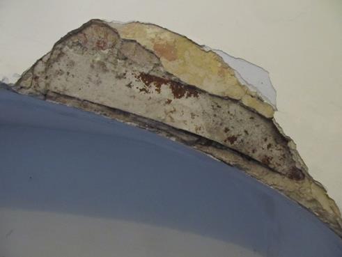 Следы замачивания, обрушение штукатурного слоя, гниение деревянного заполнения перекрытия.