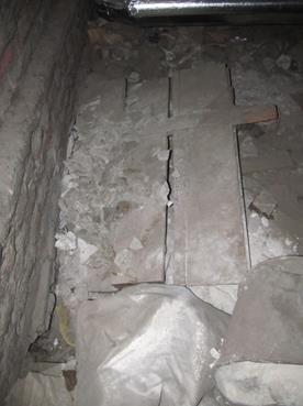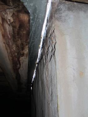 Трещина в перекрытии шириной раскрытия до 60 мм, гниение деревянного заполнения перекрытия, обрушение штукатурного слоя.