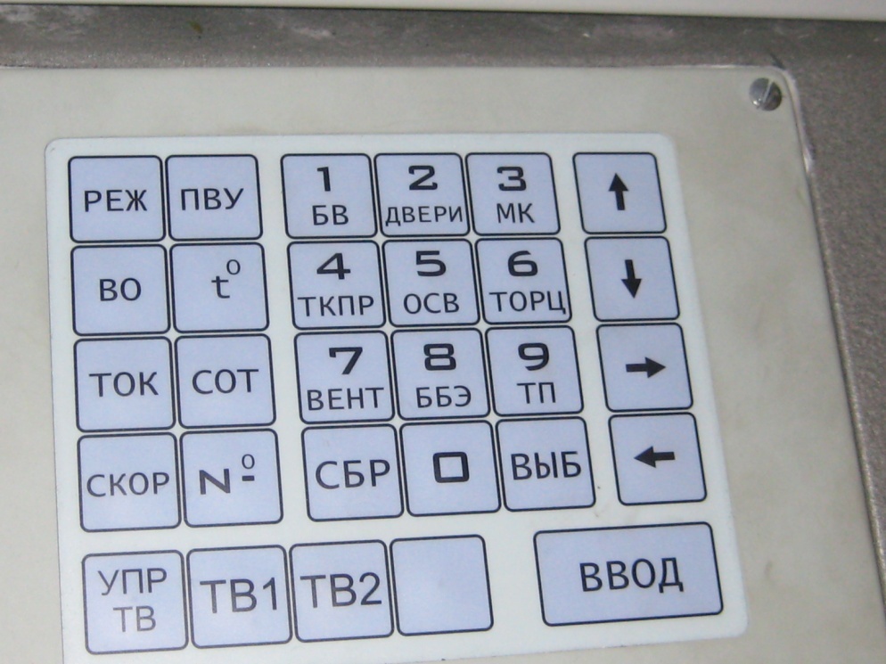 Пример. Необходимо отжать от контактного рельса башмаки токоприемников 2-го вагона: На ФКМ нажать кнопку «ПВУ» и вывести на монитор режим «ПВУ» Кнопками ↑ и ↓ на ФКМ выбрать номер вагона по порядку счета. Кнопкой «4 ТКПР» изменить положение токоприемников Сообщение состояния токоприемников изменится с «ПРИЖ» на «ОТЖ»