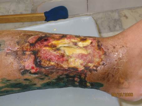 Гнилостная форма анаэробной инфекции голени после слепого пулевого ранения.