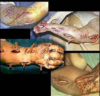 Анаэробная инфекция предплечья и кисти, отечная форма. Произведены «лампасные» разрезы.