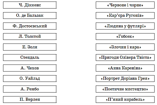 Варіант ІІ Початковий і середній рівні (кожна правильна відповідь — 1 бал) 1. Про кого з героїв роману Е. Золя «Кар’єра Ругонів» ці слова: «Революція 1848 року застала. [їх] насторожі: усі вони розлючені невдачами й готові були за горло схопити фортуну, хай би вона попалася їм на вузькій доріжці. Усі члени цієї сім’ї вичікували подій, як розбійники в засаді, що готові були кинутися на здобич»? а) Сім’ю Маккарів; б) сім’ю Ругонів; в) сім’ю Фука; г) сім’ю М’єтти. 2. Хто з героїв роману Е. Золя «Кар’єра Ругонів» уперше відчув повагу до себе з боку людей і загинув із прапором у руках? а) Сільвер; б) Паскаль; в) М’єтта; г) Антуан. 3. Зморшка жорстокості на портреті з’являється після того, як герой О. Уайльда Доріан Грей: а) дізнався про смерть Сибіли Вейн; б) убив Безіла Холлуорда; в) спричинив смерть Алана Кемпбла; г) почав вести нестримне розпусне життя. 4. Продовжте речення: «Інтелектуальний роман — це.» Достатній рівень (кожна правильна відповідь — 2 бали) 1. Схарактеризуйте образ із роману О. Уайльда «Портрет Доріана Грея», який запам’ятався найбільше. 2. З’ясуйте символіку образів роману Е. Золя «Кар’єра Ругонів» (червоного кольору, площі Св. Митра) Високий рівень (максимально — 4 бали) Виконайте одне із завдань. 1. Напишіть невеликий твір-роздум за романом О. Уайльда «Портрет Доріана Грея»: «Причини духовної деградації Доріана Грея». 2. Зважаючи на теорію натуралізму, історичні обставини й характери героїв, продовжте логічну історію синів П’єра Ругона та їхніх сімей (за романом Е. Золя «Кар’єра Ругонів»).
