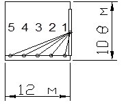 где n1 - количество лучей по графику 1 Данилюка, проходящих от неба через световые проемы в расчетную точку на поперечном разрезе помещения; n2 - количество лучей по графику 2 Данилюка проходящих от неба через световые проемы в расчетную точку на плане помещения. Определим значения n1, n2 для пяти характерных точек данного пролета: - вычерчиваем на кальке поперечный разрез и план пролёта в одном и том же масштабе; - накладываем поперечный разрез на график 1 Данилюка, совмещая полюс 0 графика с характерной точкой, а нижнюю линию с условной рабочей поверхностью, и подсчитываем количество лучей, проходящих от небосвода через световой проём - n1i; - отмечаем, что через центр светопроёма – точку С на разрезе - проходит концентрическая окружность под определенным номером; - накладываем план пролёта на график 2 Данилюка таким образом, чтобы ось светового проёма совместилась с горизонталью под номером концентрической окружности, а проекция уровня рабочей поверхности с вертикальной осью графика; подсчитываем количество лучей, проходящих от небосвода через световые проёмы n2i - значения n1i и n2i n11=10 n21=90 n12=22 n22=68 n13=17 n23=60 n14=13 n24=58 n15=11 n25=56 - на поперечном разрезе данного пролёта определяем, что середина участка неба, видимого из характерной точки через световой проём, находится под углом α; по значению угла α по таблице 35 /6/ находим коэффициент, учитывающий неравномерную яркость облачного неба МКО, qi a1=78º q1=1,27 a2=57º q2=1,15 a3=42º q3=1 a4=33º q4=0,9 a5=27º q5=0,8 - определив отношения b/h1, lпр/b, l/b и r11=1,05 r12=1,1 r13=1,15 r14=1,2 r15=1,25 - коэффициенты