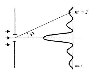 Пример №4. На узкую щель шириной a = 0,05 м падает нормально монохроматический свет длиной волны λ = 694 нм. Определите направление света на вторую дифракционную полосу (по отношению к первоначальному направлению света).