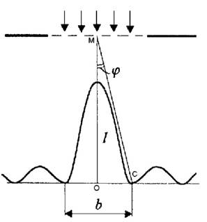 Пример №6. На щель шириной a = 0,1 мм падает нормально монохроматический свет дли-ной волны λ = 0,5 мкм. Дифракционная картина наблюдается на экране, расположенном парал-лельно щели. Определите расстояние l от щели до экрана, если ширина центрального дифрак-ционного максимума b = 1 см.