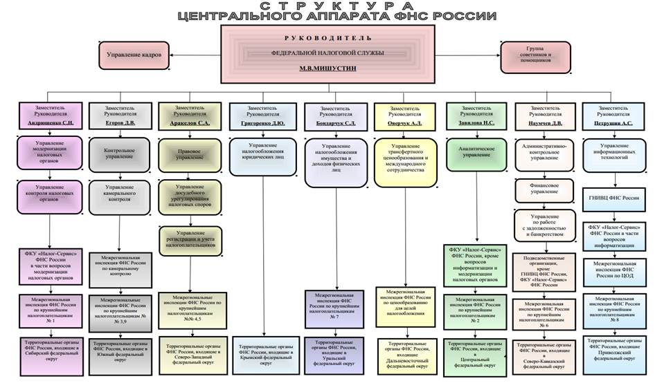 В настоящее время структура ФНС РФ включает: Руководство ФНС России Структурные подразделения центрального аппарата ФНС России Межрегиональные инспекции ФНС России Управления ФНС России по субъектам Российской Федерации Центральный аппарат объединяет ряд управлений, сформированных как по функциональному принципу, так и по видам налогов. В частности, к числу последних относятся:.