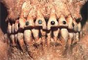 V. Практическое применение эстетики ЧЛО - «Такая красота мне не по карману» (эстетические услуги бесспорно дороги); Профессионализм врача-стоматолога заключается в том, чтобы в повседневной работе достигать максимально возможного, наряду с функциональным, и эстетического результата. Да, эстетическая стоматология, особенно в нашей стране не каждому по средствам. И часто приходится идти на компромисс, ради изготовления «низко бюджетной конструкции». Но иногда пациенты сами обращаются с пожеланиями «нанести ущерб» красоте своих зубов и протезов. Говоря о протезах, имеется в виду плакировка – вваривание в съемный пластинчатый протез металлических зубов и коронок (рис.15). Полные съемные протезы с плакировкой верхних резцов Аргументация пациентов такая: «В моем возрасте не может быть идеальных зубов без коронок – без них протез неестественно красив». А иногда можно встретить и аргумент: «С желтыми зубами будет красивее». А как можно с позиций эстетики лица расценивать возродившуюся моду на приклеивание украшений на зубы? Бесспорно, это атавизм уходящий своими корнями и традициями древнего народа Майя.