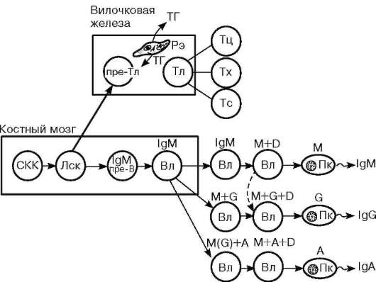 Созревание Т-лимфоцитов начинается с того, что некоторая часть лимфоидных стволовых клеток направляется в тимус, где и идет процесс созревания. В процессе дифференцировки в центральных иммунных органах стволовая клетка проходит несколько этапов без участия антигена (антигеннезависимая дифференцировка). Пока стволовая клетка находится в костном мозге, на ней появляются структуры, указывающие, по какому пути дифференцировки (Т- или В-) она пойдет. Ранний предшественник Т-лимфоцитов имеет на своей мембране гликопротеин с молекулярной массой 3,3 • 104 D (ГП-33), который впоследствии соединяется с антигенраспознающим рецептором. На втором этапе появляются незрелые предшественники Т-лимфоцитов. В этот период на мембране лимфоцитов образуются антигенраспознающие рецепторы, после этого лимфоциты способны распознавать антигены. Для Т-лимфоцита антигенраспознающим рецептором является димерная молекула, относящаяся к суперсемейству иммуноглобулинов. Появление на поверхности предшественников лимфоидных клеток определенных рецепторов служит сигналом, позволяющим клеткам дифференцироваться в специализированную линию лимфоцитов. Имеющие такие рецепторы клетки мигрируют в особую область центральных иммунных органов, где взаимодействуют с микроокружением, способствующим дифференцировке данной клетки. После контакта с клеткой-предшественником, в стромальных клетках локального микроокружения развиваются процессы, направленные на "обучение" клеток-предшественников для их дальнейшей дифференцировки в отдельную линию.