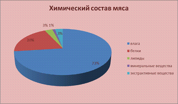 Содержание витаминов и минеральных веществ в замороженных полуфабрикатах значительно меньше, чем в свежеприготовленном продукте. На рисунке 1 показано, что большую часть мяса составляет мышечная ткань и в ее химический состав входят: · влага 73-77 % от общего веса, · белки 18-21 %, · липиды 1-3 %, · минеральные вещества (0,8—1,0 %), · экстрактивные вещества (1,7—2 % азотистых, 0,9—1,2 % безазотистых).
