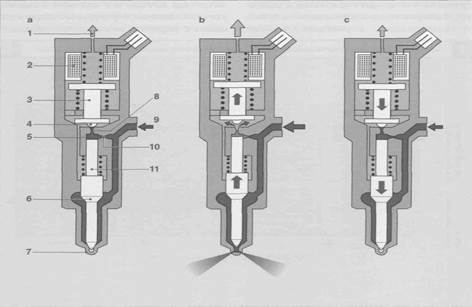 1 - магістраль зворотного зливу палива; 2 - котушка електромагніту; 3 - якір електромагніту; 4 - кулька клапана; 5 - камера керуючого клапана; 6 - конус голки розпилювача; 7 - отвір розпилювача; 8 - дросельний отвір відводу палива; 9 - магістраль високого тиску; 10 - дросельний отвір подачі палива; 11 - поршень керуючого клапана; а) Форсунка в стані спокою; b) Форсунка відкрита; c) Форсунка закрита Рисунок.3.8 – Будова та принцип дії форсунок системи впорскування Date: 2015-07-01; view: 820; Нарушение авторских прав |