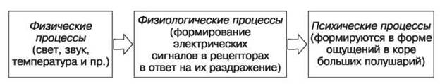 Физиологические основы ощущений. Ощущение — простейший психический процесс, состоящий в отражении отдельных свойств предметов и явлений при их непосредственном воздействии на соответствующие рецепторы. Рецепторы — это чувствительные нервные образования, которые воспринимают воздействие внешней или внутренней среды и кодируют его в виде набора электрических сигналов. Последние затем поступают в мозг, который их расшифровывает. Этот процесс сопровождается возникновением простейших психических явлений — ощущений.