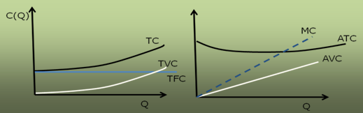 При убывающей отдаче от переменного фактора затраты факторов растут в большей пропорции по сравнению с увеличением объема выпуска и функция затрат становится возрастающей - типа ТС = а + bQ + cQ2. Средние переменные издержки АVС = (b + cQ) и предельные издержки MC=b+2cQ – растут, причем предельные более высокими темпами. Средние общие издержки производства ATC=a/Q+b+cQ первоначально снижаются из-за снижения средних постоянных издержек. Но так как предельные издержки растут, то для какого-то объема выпуска их значения превысят значения средних общих издержек и последние начнут расти.
