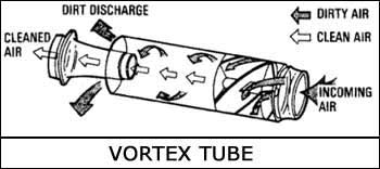 3 – сурет. Ауаны алдын ала тазарту үшін пластмассадан жасалған пластмасса сүзгінің пласмассадан жасалған тақталары V –тәрізі тор сүзгілерден кейін ауа алдын ала тазалау үшін пластмассадан жасалған сегіз пластмасса тақтадан тұратын блокты сүзгіге келіп түседі. Осындай тақтаның әрқайсысында ауаның қозғалысы құйын сипатына енетін 54 құбыр бар. Әр құбыр шағын циклонды шаңұстағыш ретінде әрекет жасайды. Құбырларға айналмалы қалақшалар орнатылады, олармен бағытталған ауа ағыны торнадаға ұқсайды. Орталықтандырылған күштер шаңның тиісті ауыр бөлшектерін ауа ағынының шеттігіне жібереді. Таза ауадан бөлініп шыққан «лас ауа» алдын ала тазалау сүзгісінің құбырларынан шығарда сору желдеткішінің ауа жинағышына келіп түседі.