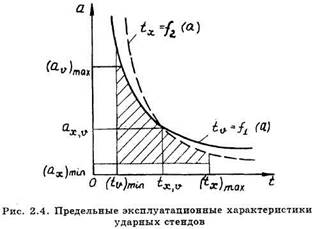 На рис. 2.4 приведены предельные эксплуатационные характеристики ударного стенда, где приняты следующие обозначения: (аv) max— максимальное ударное ускорение при ограничении по скорости соударения; (ах)тiп — минимальное ударное ускорение при ограничении по пути торможения; (tv)min — минимальная длительность переднего фронта ударного импульса; (tх)max — максимальная длительность переднего фронта ударного импульса; tv = f1(a) — зависимость изменения длительности переднего фронта ударного импульса от ударного ускорения при ограничении по скорости соударения; tх = f2(a) — зависимость изменения длительности переднего фронта ударного импульса от ударного ускорения при ограничении по пути торможения. Заштрихованная область показывает, какие длительности переднего фронта ударного импульса и максимальное ударное ускорение можно воспроизводить на данном ударном стенде. Длительность заднего фронта ударного импульса и его форма определяются упругими свойствами применяемого тормозного устройства.