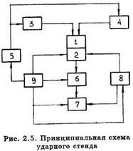 Более сложным образом уточняются условия воспроизведения в тех случаях, когда либо требуемые пути торможения хмах превышают возможности простейших деформируемых элементов (т.е. измеряются десятками и сотнями миллиметров), либо заданный закон a(t) не соответствует по форме воспроизводимому с помощью этих элементов закону изменения ударного ускорения во времени. Задача в принципе становится менее определенной, и основными критериями при выборе условий воспроизведения будут величины v0 и хмах, найденные в результате интегрирования зависимости a(t). Правильный выбор тормозного устройства будет во многом зависеть от интуиции инженера-испытателя и имеющихся в его распоряжении технических средств. Наиболее трудоемок процесс подготовки к ударным испытаниям, когда непременным условием является максимально возможная точность соблюдения закона изменения ударного ускорения во времени a(t). При этом величины v0 и xmах определяются довольно жестко, а для обеспечения зависимости a(t) необходимо проектировать специальное тормозное устройство, основанное на наиболее целесообразном для этого случая принципе действия (пневматическом или гидравлическом). 4. Окончательное уточнение условий воспроизведения на основе пробных экспериментов в лаборатории. Ударный эксперимент следует считать полностью подготовленным, если в результате анализа исходных данных [ a(t), а п, τф] определен способ создания требуемой скорости v0, выбрана и реализована конструкция тормозного устройства, обеспечивающая предельный путь торможения х пр и заданный закон изменения ударного ускорения во времени a(t), а также имеются необходимые вспомогательные устройства, контрольно-измерительная и регистрирующая аппаратура. После того как условия эксперимента в результате пробных опытов окончательно уточнены и установлено полное соответствие получаемых параметров ударного импульса заданным, можно переходить к основным испытаниям. 3.3. Ударные стенды Требования, предъявляемые к ударным стендам. Стендовое оборудование для проведения ударных испытаний должно обеспечивать: — широкие диапазоны воспроизводимого ударного ускорения — — стабильность параметров воспроизводимого ударного процесса; — минимальные побочные воздействия на испытываемое изделие; — воспроизводимость процесса испытаний, исключающую неоднозначность получаемых результатов; — простоту перемонтажа стенда для различных режимов имитации воздействующих факторов; — простоту и удобство в управлении заданным испытательным режимом, возможность ручного и автоматического управления; — максимальную автоматизацию и механизацию операций, — проведение испытаний в короткие сроки и с минимальны Принципиальная схема ударного стенда. В общем виде принципиальная схема ударного стенда, действие которого основано на принципе торможения, включает в себя следующие элементы (рис. 2.5): ударную установку, состоящую из платформы 1 с закрепленным на ней испытываемым изделием 2; средство разгона платформы 3; тормозное устройство 4; систему управления 5; первичные преобразователи 6; регистрирующую аппаратуру 7 для записи исследуемых параметров изделия и закона ударного ускорения; вспомогательные приборы 8 для регулировки электрического режима испытываемого изделия или иного режима его функционирования, изме