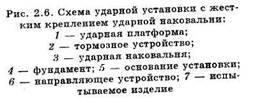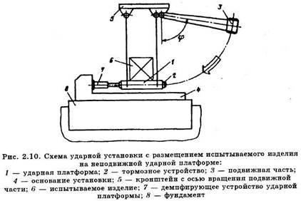 Ударные установки, действие которых основано на принципе торможения, по способу получения требуемой скорости соударения разделяют на установки со свободным падением подвижной части и установки с принудительным разгоном подвижной части. Установки со свободным падением подвижной части отличаются простотой конструкции и могут быть с вертикально падающей подвижной частью (см. рис. 2.6), с подвижной частью, падающей по наклонной плоскости (см. рис. 2.7), и маятникового типа (см. рис. 2.10). Основным достоинством таких устано