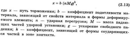 где v — скорость подвижной части стенда в процессе торможения, v0 — начальная скорость соударения; t — время, х — деформация тормозного устройства. Для тормозных устройств, деформации которых носят упругий и упругопластический характер, справедливы следующие соотношения: