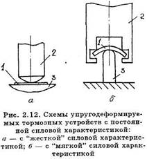 Тормозные устройства смятия и внедрения характеризуются тем, что максимальному пути торможения соответствует максимальная ударная перегрузка. Они применяются для воспроизведения ударных импульсов несимметричных форм. В тормозных устройствах проникания (рис. 2.11, г) ударный импульс формируется за счет проникания жесткого цилиндрического ударника 2 с профилированным наконечником в пластически деформируемую среду 1 (например, свинец). Силовая характеристика устройства проникания состоит из двух участков и зависит от формы профилированной части, диаметра ударника и материала деформируемой среды. Пути торможения могут быть значительными и зависят от скорости соударения. Характерной особенностью устройств проникания является достижение максимальной ударной перегрузки на участке внедрения в деформируемую среду профилированного наконечника ударника, а затем обеспечение постоянства этого значения на участке проникания в деформируемую среду цилиндрической части ударника. Применение тормозных устройств этого типа может обеспечить получение ударных перегрузок в широком диапазоне значений форм закона изменения во времени с большим временем нарастания, доходящим до десятков миллисекунд. Основные недостатки необратимо деформируемых тормозных устройств: невозможность их повторного использования в связи с изменением формы деформируемого элемента в процессе соударения; необходимость большого объема экспериментальных работ по определению геометрических форм и выбору материалов соударяющихся элементов, определяющих требуемую для воспроизведения заданного нагружения силовую характеристику тормозного устройства. Для каждого типоразмера ударного импульса необходимо свое тормозное устройство. К преимуществам необратимо деформируемых тормозных устройств следует отнести простоту их конструкции. Упругодеформируемые тормозные устройства. Характерной особенностью этих устройств является наличие упругодеформируемого элемента, который при соударении изменяет свою форму в пределах упругих деформаций, а по окончании ударного процесса восстанавливает свои первоначальные свойства. Это достигается за счет соответствующей силовой характеристики, по виду которой упругодеформируемые тормозные устройства разделяют на устройства с постоянной и переменной силовой характеристикой.