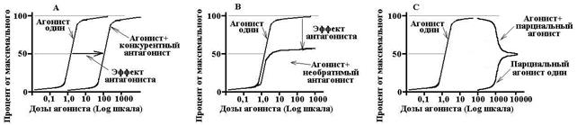 Схема 9. Виды антагонизма. А – конкурентный антагонист смещает кривую «доза-эффект» вправо, т.е. снижает чувствительность ткани к агонисту, не изменяя его эффект.В – неконкурентный антагонист снижает величину ответа ткани (эффект), но не влияет на ее чувствительность к агонисту. С – вариант применения парциального агониста на фоне полного агониста. По мере повышения концентрации парциальный агонист вытесняет полный из рецепторов и в итоге ответ ткани снижается от максимального ответа на полный агонист, до максимального ответа на агонист парциальный. Неконкурентные антагонисты применяются в медицинской практике реже. С одной стороны они имеют несомненное преимущество, т.к. действие их не может быть преодолено после связывания с рецептором, а значит не зависит ни от периода полуэлиминации антагониста, ни от уровня агониста в организме. Эффект неконкурентного антагониста будет определяться лишь скоростью синтеза новых рецепторов. Но с другой стороны, если происходит передозировка данного лекарства, устранить его эффект будет чрезвычайно сложно.