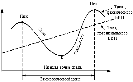 Рис. 36.2. Производственная функция В. Леонтьева Если Таким образом, неоклассическая и посткейнсианская модели позволяют выработать стратегии развития для национальных экономик, используя тот фактор производства, который может обеспечить наибольший экономический рост. В 1961г. американский экономист Э.Фелпс вывел правило накопления, названное «золотым». В общем виде золотое правило накопления можно сформулировать так: уровень накопления капитала, обеспечивающий наивысшее потребление общества и устойчивое состояние экономики, называется золотым уровнем накопления капитала, т.е. оптимальный равновесный уровень экономики будет достигнут при условии полного инвестирования дохода от капитала. Тема. Экономический цикл: причины, типы. «Длинные волны» Экономические циклы – регулярные колебания в движении общественного производства, повторяющиеся за определенный промежуток времени (рис.37.1).