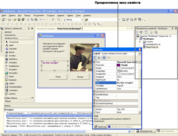 Если инструмент в среде разработки представлен плавающим окном, вы можете вернуть его в его первоначальное закрепленное положение, дважды щелкнув мышью на строке его заголовка. (Эта же техника применялась в последнем упражнении для раскрытия закрепленного окна: двойной щелчок на строке заголовка работает в ту или другую сторону между двумя стандартными положениями окна.) Когда окно находится в плавающем незакрепленном режиме, его можно закрепить в новом месте. Это может понадобиться, чтобы освободить место в Visual Studio для конкретной задачи программирования, например, для работы над графическим интерфейсом в Windows Forms Designer (Конструкторе Windows Forms). Давайте попробуем закрепить окно Properties (Свойства) на новом месте. Закрепление окна Properties (Свойства) 1. Убедитесь, что окно Properties (Свойства) (или другой инструмент, который вы хотите передвинуть) представлено в среде разработки Visual Studio плавающим окном и не закреплено. Если вы выполнили предыдущее упражнение, то окно Properties (Свойства) будет именно в таком виде. 2. Перетащите окно Properties (Свойства) за его строку заголовка к верхнему, нижнему, правому или левому краю среды разработки, пока граница окна не "прилипнет" к краю окна среды разработки. Эта привязка указывает, что, когда вы отпустите кнопку мыши, окно будет закреплено в этом месте. Заметьте, что существует несколько допустимых мест закрепления окон инструментов Visual Studio, так что вы можете попробовать использовать два или три различных положения, пока не найдете то, которое устроит вас больше всего. (Окно должно быть расположено в удобном месте, но не мешать другим используемым окнам инструментов.) 3. Чтобы закрепить окно Properties (Свойства), отпустите кнопку мыши. Окно будет находиться в том месте, где вы его оставили.