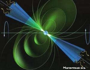 | Пульсар - это просто огромный намагниченный волчок, крутящийся вокруг оси, не совпадающей с осью магнита. Если бы на него ничего не падало и он ничего не испускал, то его радиоизлучение имело бы частоту вращения и мы никогда бы его не услышали на Земле. Но дело в том, что данный волчок имеет колоссальную массу и высокую температуру поверхности, да и вращающееся магнитное поле создает огромное по напряженности электрическое поле, способное разгонять протоны и электроны почти до световых скоростей. Причем все эти заряженные частицы, носящиеся вокруг пульсара, зажаты в ловушке из его колоссального магнитного поля. И только в пределах небольшого телесного угла около магнитной оси они могут вырваться на волю (нейтронные звезды обладают самыми сильными магнитными полями во Вселенной, достигающими 1010-1014 гаусс, для сравнения: земное поле составляет 1 гаусс, солнечное - 10-50 гаусс). Именно эти потоки заряженных частиц и являются источником того радиоизлучения, по которому и были открыты пульсары, оказавшиеся в дальнейшем нейтронными звездами. Поскольку магнитная ось нейтронной звезды необязательно совпадает с осью ее вращения, то при вращении звезды поток радиоволн распространяется в космосе подобно лучу проблескового маяка - лишь на миг прорезая окружающую мглу. Открытие в 1932 году новой элементарной частицы - нейтрона заставило астрофизиков задуматься над тем, какую роль он может играть в эволюции звезд. Два года спустя было высказано предположение о том, что взрывы сверхновых