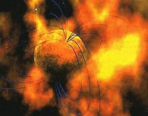 | предложена модель магнетара-нейтронной звезды со сверхсильным магнитным полем. Если нейтронная звезда рождается, вращаясь очень быстро, то совместное влияние вращения и конвекции, которая играет важную роль в первые несколько секунд существования нейтронной звезды, может создать огромное магнитное поле в результате сложного процесса, известного как «активное динамо» (таким же способом создается поле внутри Земли и Солнца). Теоретики были поражены, обнаружив, что такое динамо, работая в горячей, новорожденной нейтронной звезде, может создать магнитное поле, в 10 000 раз более сильное, чем обычное поле пульсаров. Когда звезда охлаждается (секунд через 10 или 20), конвекция и действие динамо прекращаются, но этого времени вполне достаточно, чтобы успело возникнуть нужное поле.