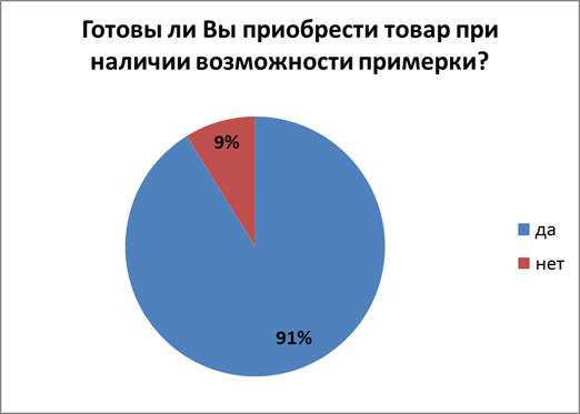 На вопрос о возможности примерки одежды положительно ответили 91% опрошенных, но 18% не готовы к покупке одежды онлайн даже при наличии такой возможности. Иными словами, потребитель готов заказывать товар через Интернет, если ему будет представлена возможность примерить заказываемую одежду.